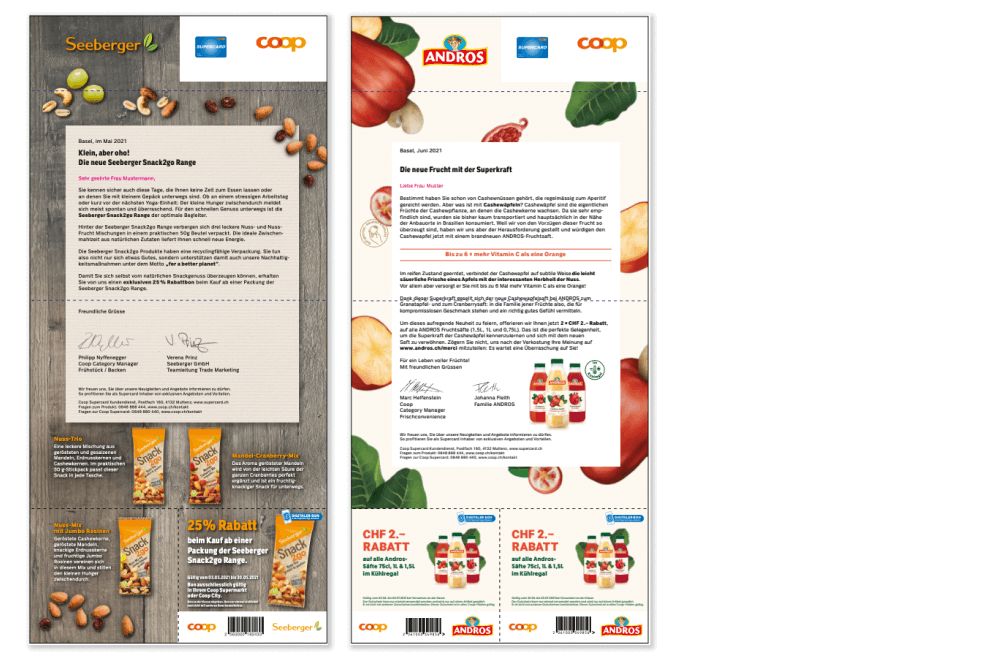 Zielgruppenspezifische postalische Mailings an 3,3 Mio. aktive Coop Supercard Mitgliederhaushalte oder 700'000 aktive Hello Family Club Familienhaushalte inkl. Bon-Integration.