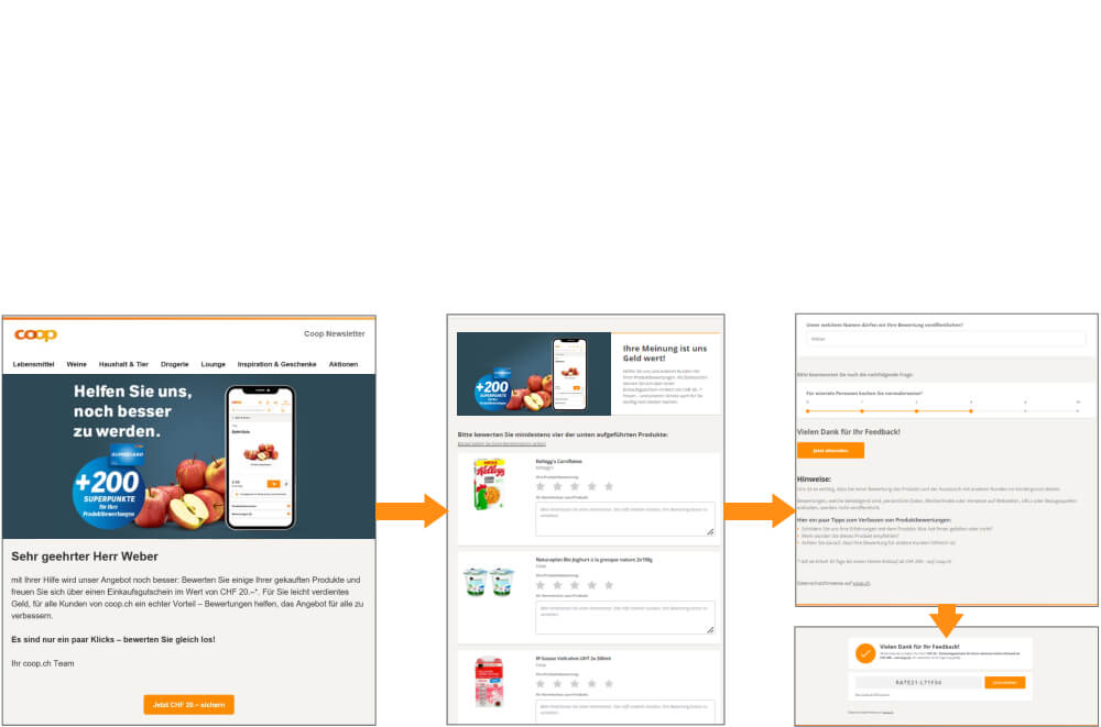 Holen Sie die Meinungen von Ihren Konsument:innen nach deren Einkauf ab und generieren Sie dabei einen Mehrwert für künftige Konsumenten:innen und Ihr Produkt. Besonders bei Neuheiten, Aktionen oder Online Samplings sind Konsument:innen affin für eine Produktbewertung und hilft eine solche zum Kaufentscheid.