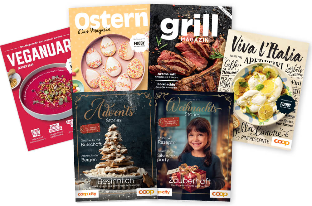Zielgruppenspezifische Themenmagazine, welche als Beilage in der Coop Presse verschickt und in diversen Coop Verkaufsstellen aufgelegt werden (zielgruppenspezifische Teilauflage).