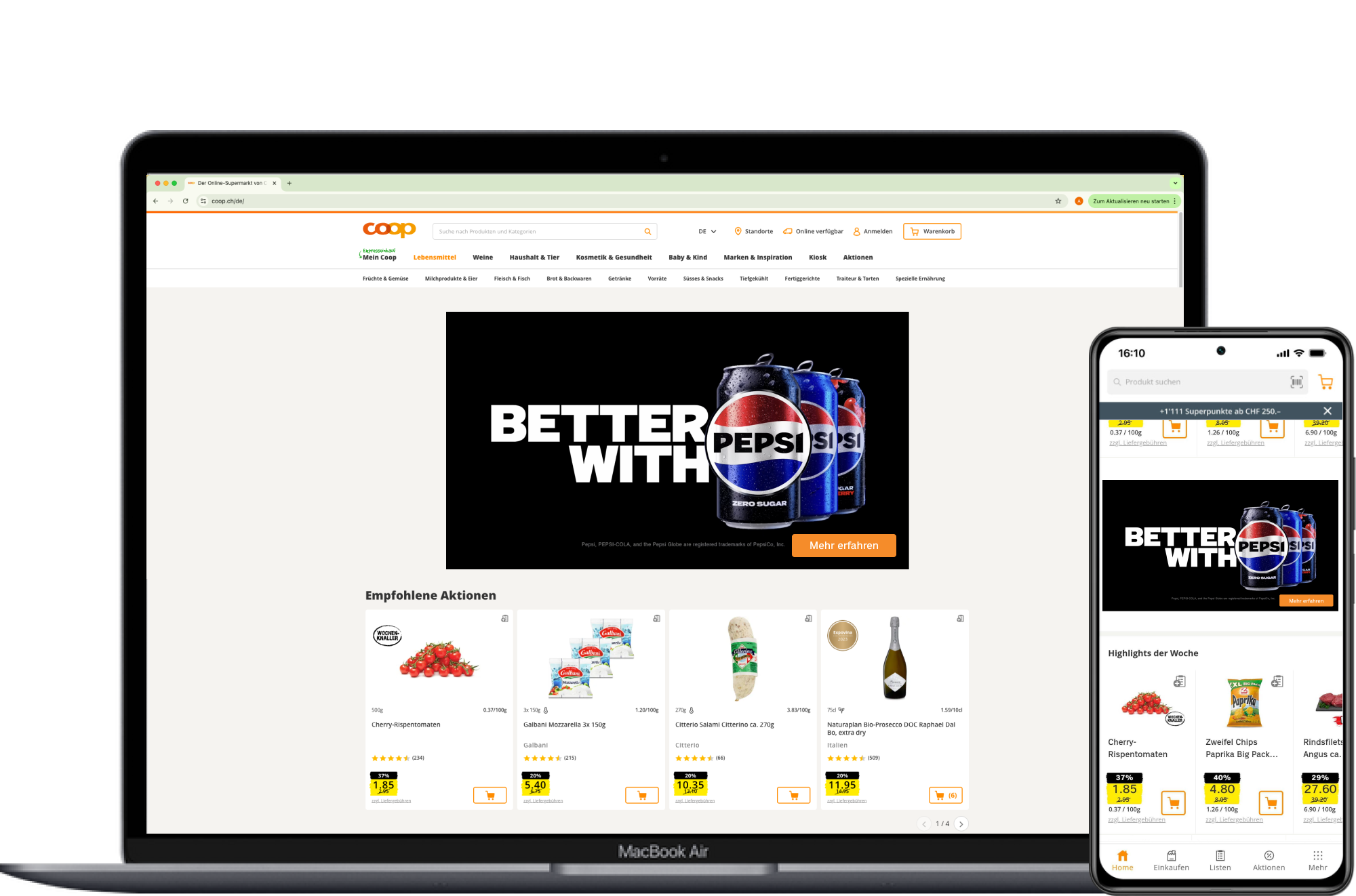 Banner auf der Homepage und Subsites von coop.ch mit interner Verlinkung auf die Produkte. Durchschnittlich über 800'000 Besuche pro Woche auf der coop.ch Webseite.